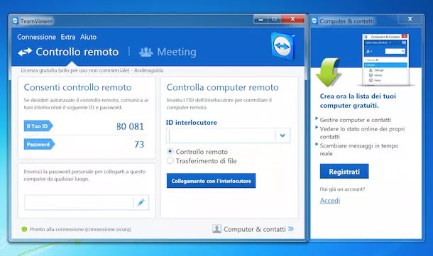 Bene. Ora puoi utilizzare TeamViewer per comandare il computer di un’altra persona a distanza o far controllare il tuo PC da remoto. Naturalmente il programma dev’essere installato su entrambi i computer.
